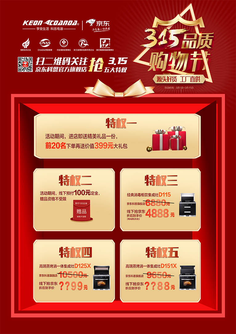 為感謝消費者們一直以來的支持,集成灶十大品牌、廚電行業十大品牌科恩電器315傾情奉獻,開啟“315品質購物節”活動,開年第一大戲,科恩電器開誠相見,5大特權限時搶購,活動升級、火力全開!特權一:活動期間進店即送精美禮品一份,前20名下單再送價值399元大禮包;特權二:活動期間線下預付100元定金,贈品資格將不受限;特權三:經典消毒柜款集成灶D115,線下搶京東折后到手價僅需4888元;特權四:高端蒸烤消一體集成灶D125X、D151X,線下搶京東折后到手價低至底價!多重優惠一降到底,讓利價碼,牛轉乾坤!