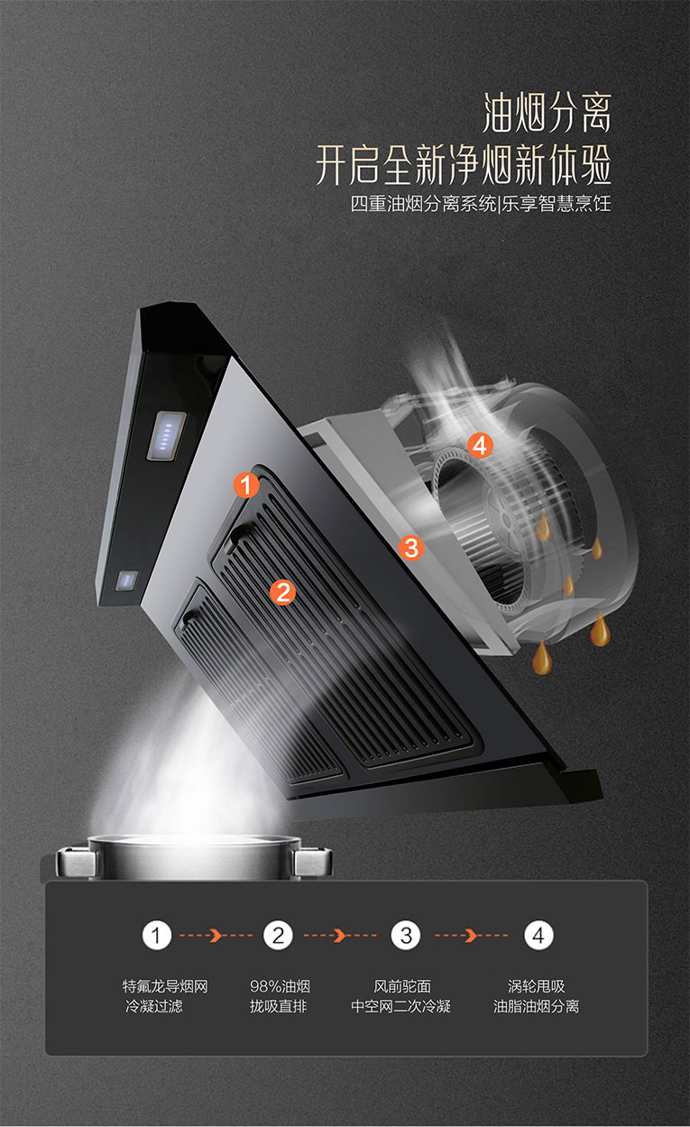 為了達到精準控煙效果,科恩6520大吸力體感觸控煙機擁有900mm攏煙大寬屏,如巨幕般籠罩,快速捕獲升騰油煙,形成有效油煙封鎖帶,迅速攏煙,將油煙“收入囊中”。四重油煙分離系統:特氟龍導煙網冷凝過濾→98%油煙攏吸直排→中空網二次冷凝→渦輪甩吸油脂油煙分離。將油煙一網打盡,還原無煙廚房助推凈煙升級,開啟全新凈煙新體驗,卡扣式隔煙屏采用特氟龍工藝技術,不沾油輕松易打理。