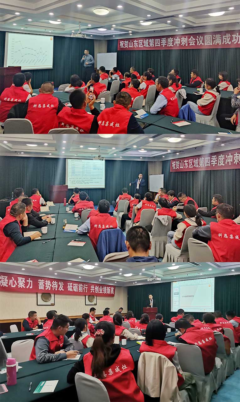 10月13-14日,集成灶十大品牌、廚電行業十大品牌科恩集成灶山東區域第四季度沖刺會在山東圓滿召開,大區/區域/總經辦相關負責人以及科恩山東區域核心經銷商齊聚一堂,認真總結分析市場,并進行針對性特訓,展開全方面營銷技能培訓與交流,助力終端業績快速增長。