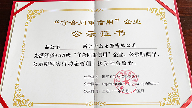 根據(jù)《浙江省“守合同重信用”企業(yè)公示辦法》規(guī)定,由企業(yè)自愿申報、系統(tǒng)自動測評、各地核實推薦、大數(shù)據(jù)比對和雙隨機實地核查,2021年浙江省AAA級“守合同重信用”企業(yè)公示名單出爐,憑借著誠信守法的“契約”精神,嚴謹規(guī)范的合同管理體系以及良好的經(jīng)營效益,進一步強化“守法”意識的浙江科恩電器有限公司榮獲浙江省AAA級“守合同重信用”榮譽。