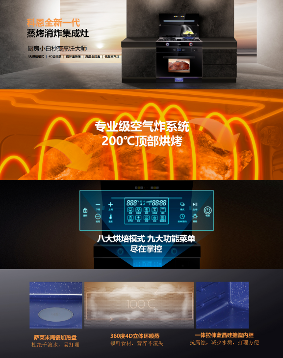 C系列集成灶配備的四項行業(yè)領(lǐng)先創(chuàng)新技術(shù):火力精控系統(tǒng)、納米無指紋易潔工藝、超級消毒系統(tǒng)、蒸烤消炸混動系統(tǒng)——直擊當(dāng)下消費痛點,徹底解決用戶使用需求,從大火力大吸力、易清潔易打理、廣收納懂消殺、多功能全集成四個維度力破當(dāng)下行業(yè)四大頑固堵點。