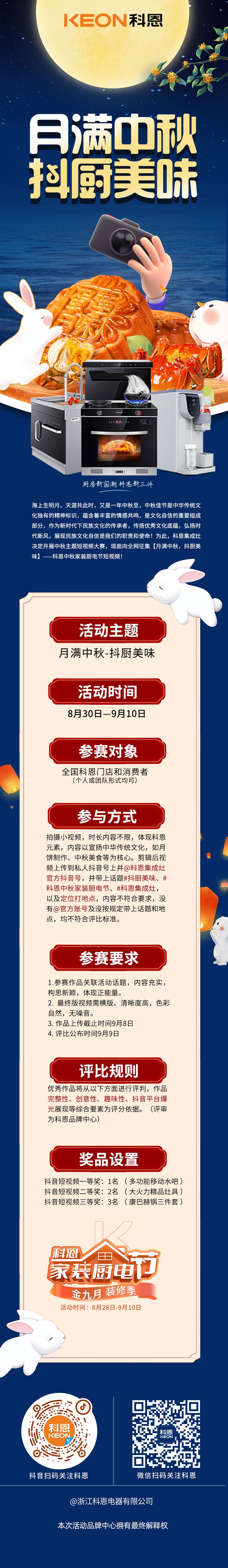 心動不如行動!除了1元享特權(quán)和直播大抽獎活動,小科還為大家準備了【月滿中秋,抖廚美味】科恩家裝廚電節(jié)中秋短視頻征集活動,炫酷、創(chuàng)意、戲精、腦洞、鬼馬,你想不想拍一段能“火”的視頻?拿起手機,“抖”出精彩,你敢拍我就敢送!