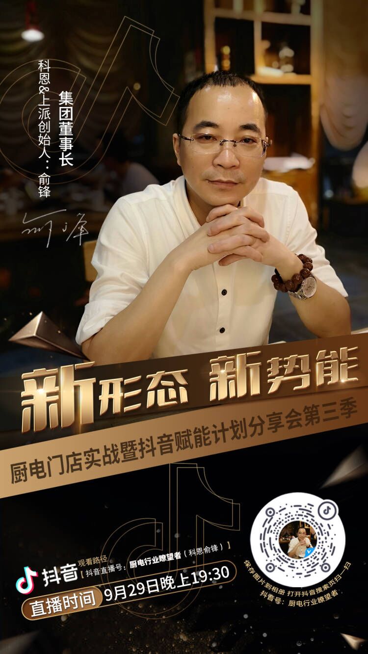 集團董事長、科恩&上派創始人俞鋒親自領軍征戰新零售流量變現風口,科恩新媒體事業中心資深團隊導師護航,助力廚電行業實體店打造線上引流線下獲客的私域裂變!9月29日19:30, 鎖定抖音直播間,董事長俞鋒親自掛帥,為您傾情分享新形態下實體店聚勢掘金新勢能!