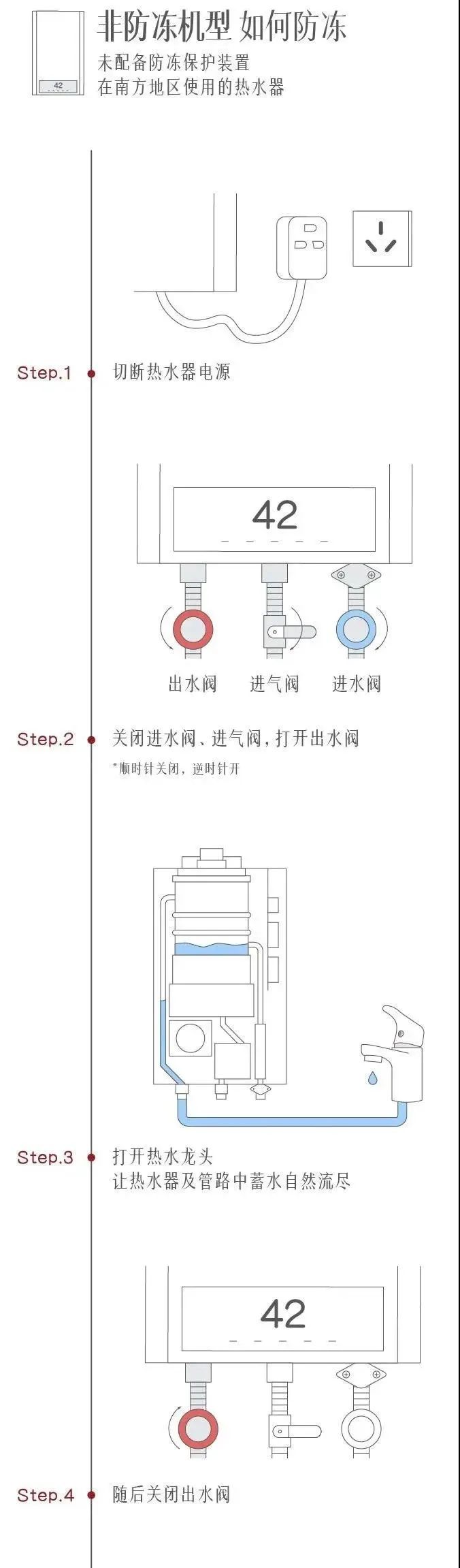 寒冬已至!當室外溫度低于0℃時,使用完熱水器后,若不及時將熱水器里的水排干凈,冷空氣變會倒灌進熱水器內部,水結冰后體積膨脹,容易凍壞熱水器水箱,造成不必要的麻煩和損失!因此,做好熱水器的防凍措施非常有必要!關于熱水器會被凍裂這件事,可能很多人都不會在意,為了讓大家能更好的了解熱水器如何防凍,這份防凍指南,你必須get!