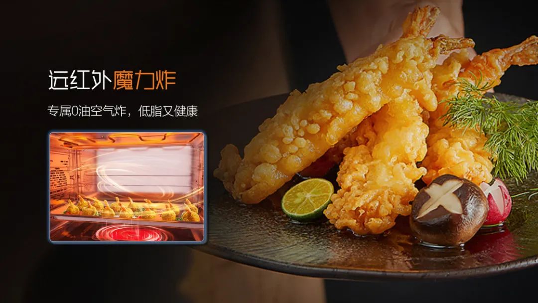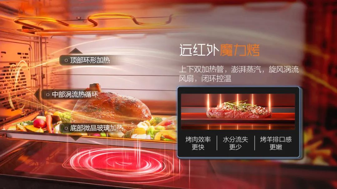 立體勻烤:頂部環(huán)形加熱管+循環(huán)風(fēng)機(jī)+底部隱形加熱管,360度無死角烤制讓食材均勻受熱外酥里嫩烤的更專業(yè)。