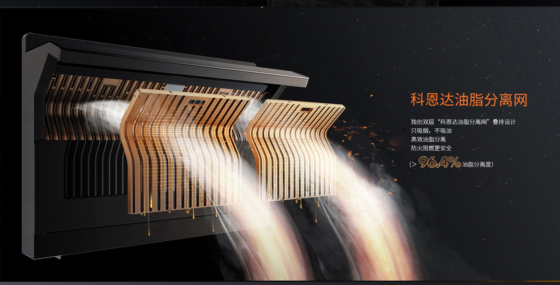 科恩達油脂分離網,雙層疊排設計,杜絕明火進入煙腔,防火阻燃更安全!