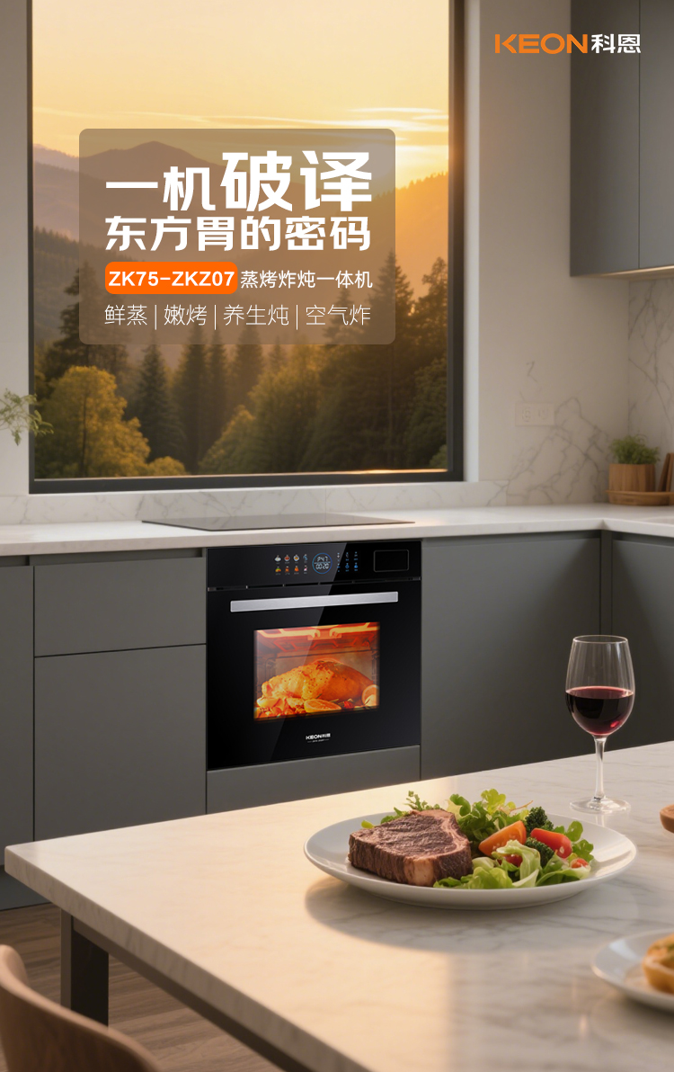 蟬鳴喚醒夏日味蕾,科恩以舊換新計劃火熱開啟。老舊蒸箱烤箱占據(jù)半壁江山,科恩ZKZ07以“一機全能”終結雜亂,傳統(tǒng)廚電退場,美味迭代正當時。這個夏天,邀您共赴煥新盛宴,讓ZKZ07成為廚房中樞,以48種星圖風味,繪制屬于您家的煙火史詩。