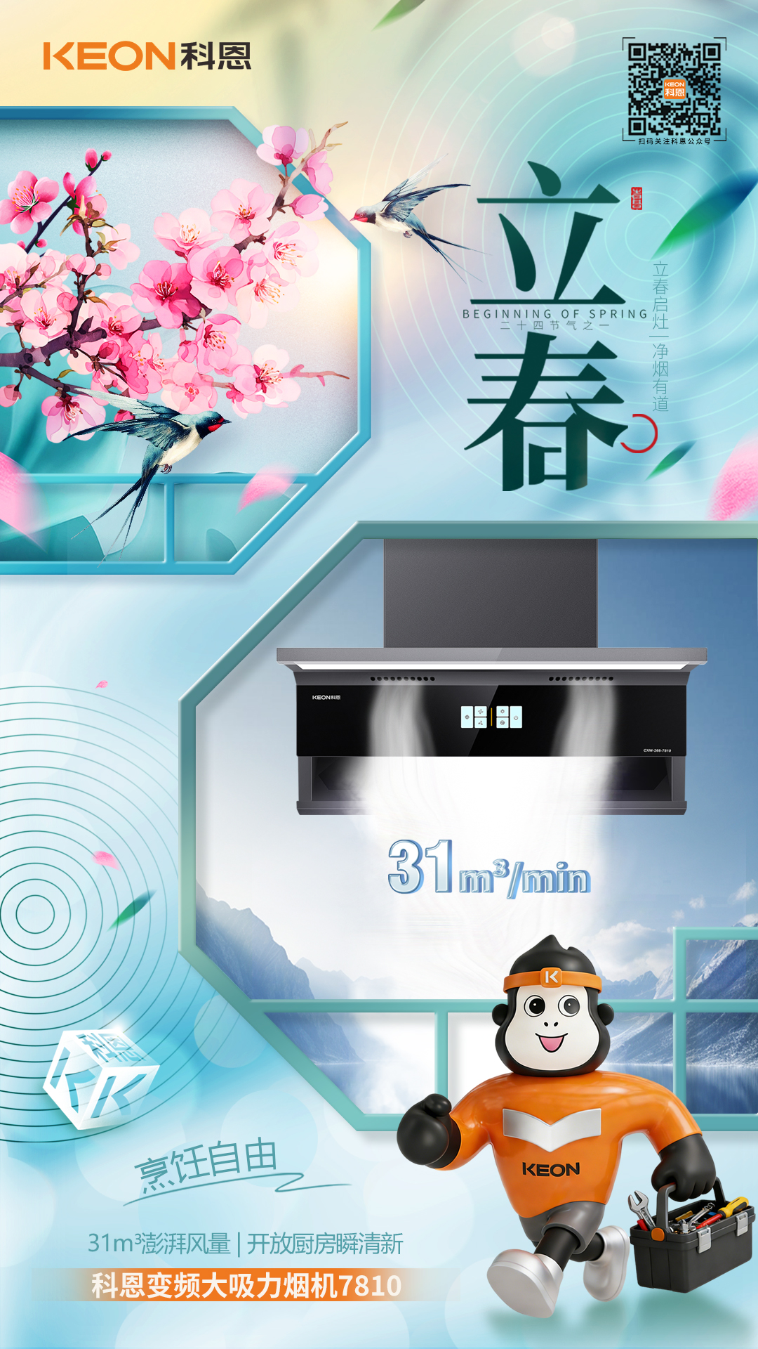 立春啟灶,凈煙有道。新綠破寒時,廚香伴清歡,科恩煙機 7810,以立春煥新之姿,重構「無煙廚房」的烹飪美學,讓每一次掌勺都成為自由呼吸的享受。