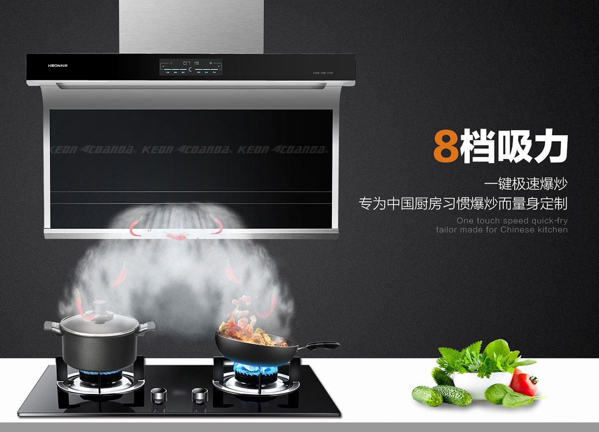 - 一鍵爆炒,8檔吸力,專為中國(guó)廚房習(xí)慣爆炒而量身定制。