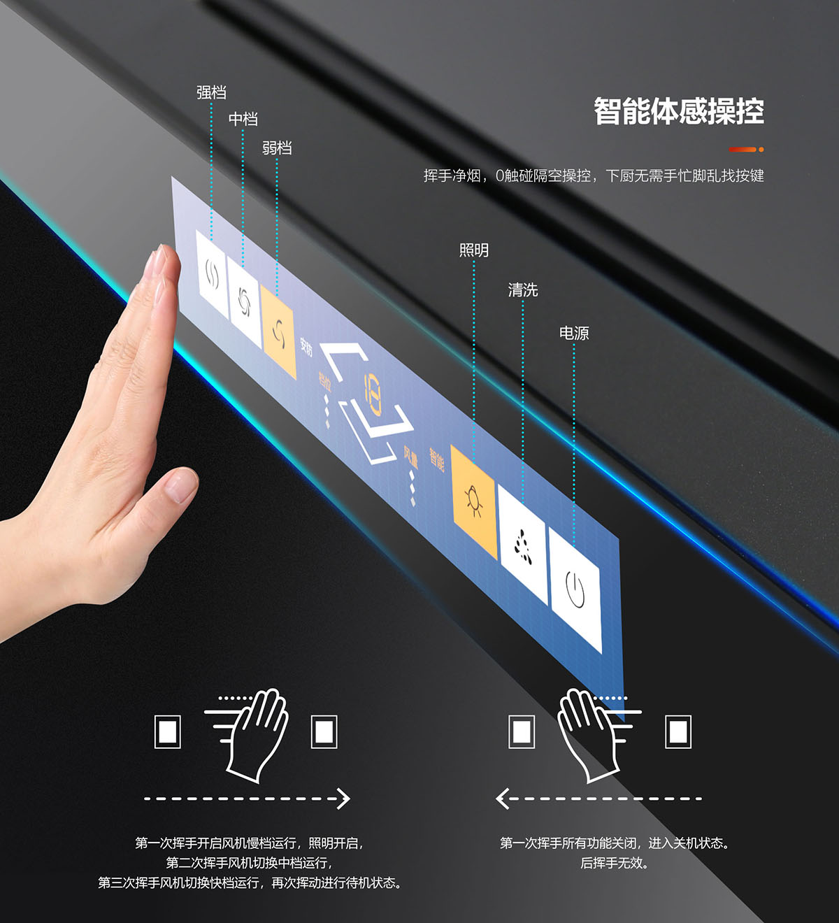 - 智能體感操控,揮手凈煙,0觸碰隔空操控,下廚無需手忙腳亂找按鍵