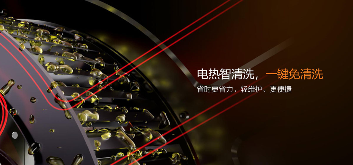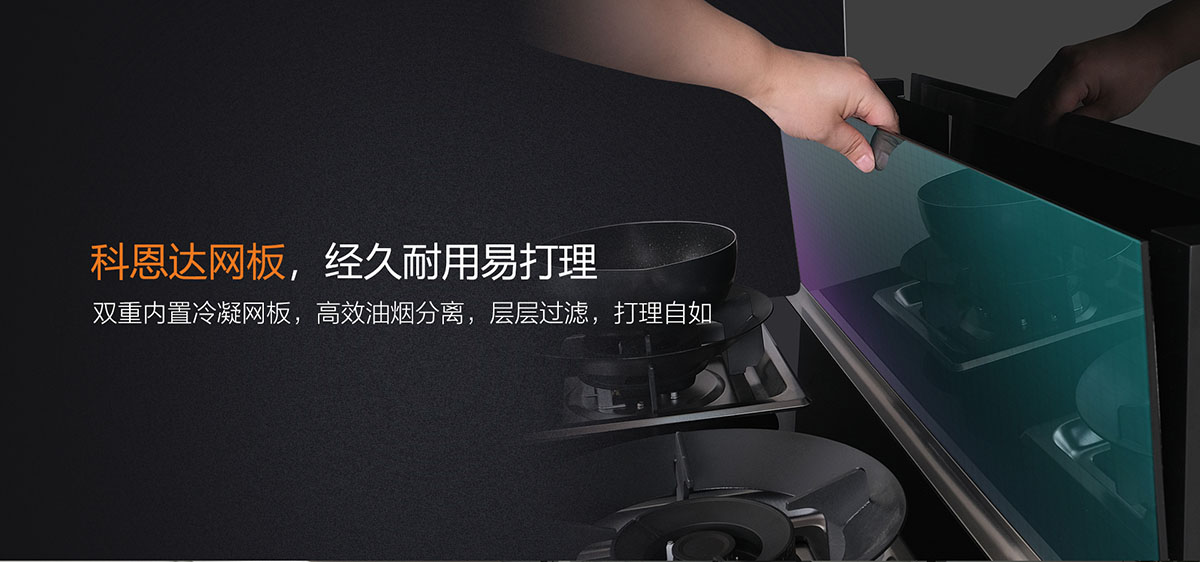 - 雙重冷凝網(wǎng)板,高效油煙分離,打理方便自如