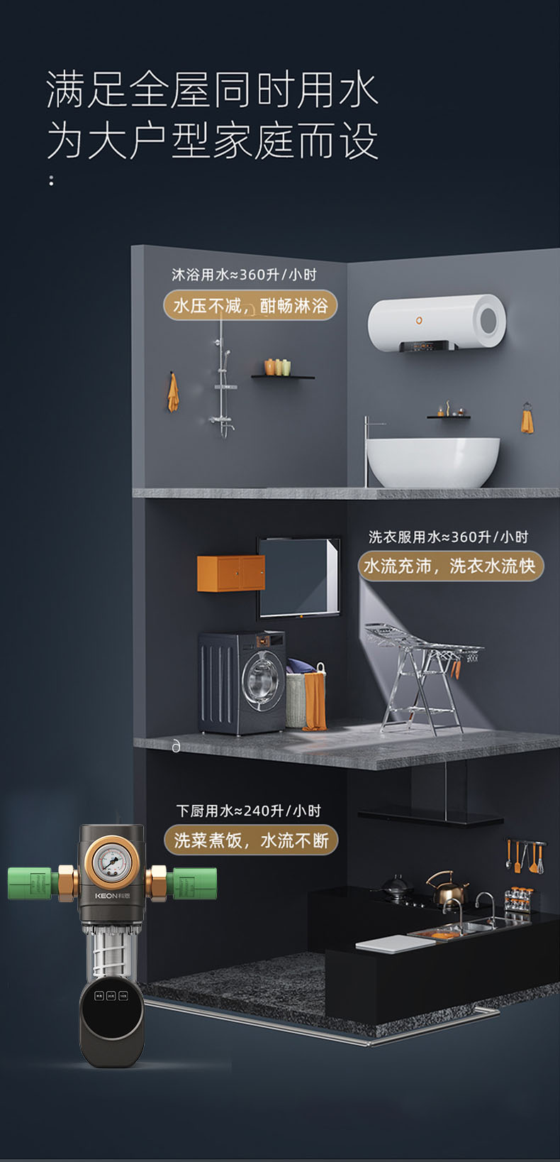 - 6噸/小時大流量,快速過濾,用水無壓力